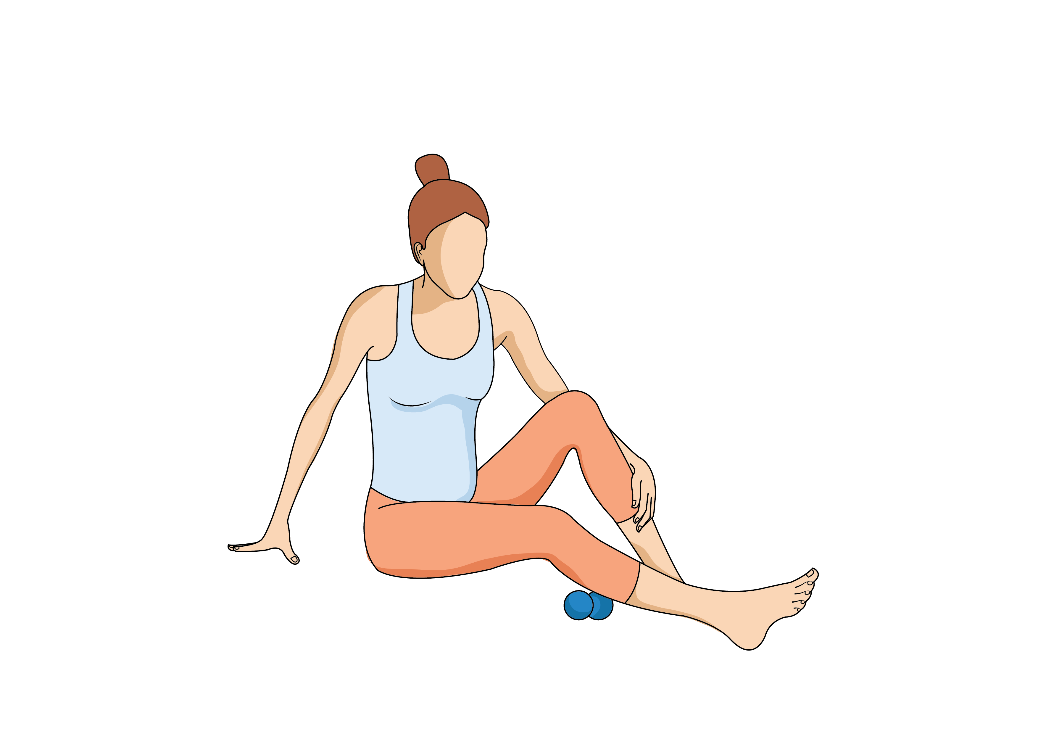 Sit on the ground or mat. Stretch out the leg you want to work while bending your other knee at 90 degrees. Put the massage ball at the top of your hamstring muscles. Place your hands on the floor behind you, keeping your elbows straight. Lift off the ground and roll your leg side to side on the massage ball. Then, reposition the massage ball just above your knee and repeat the same side to side movement.