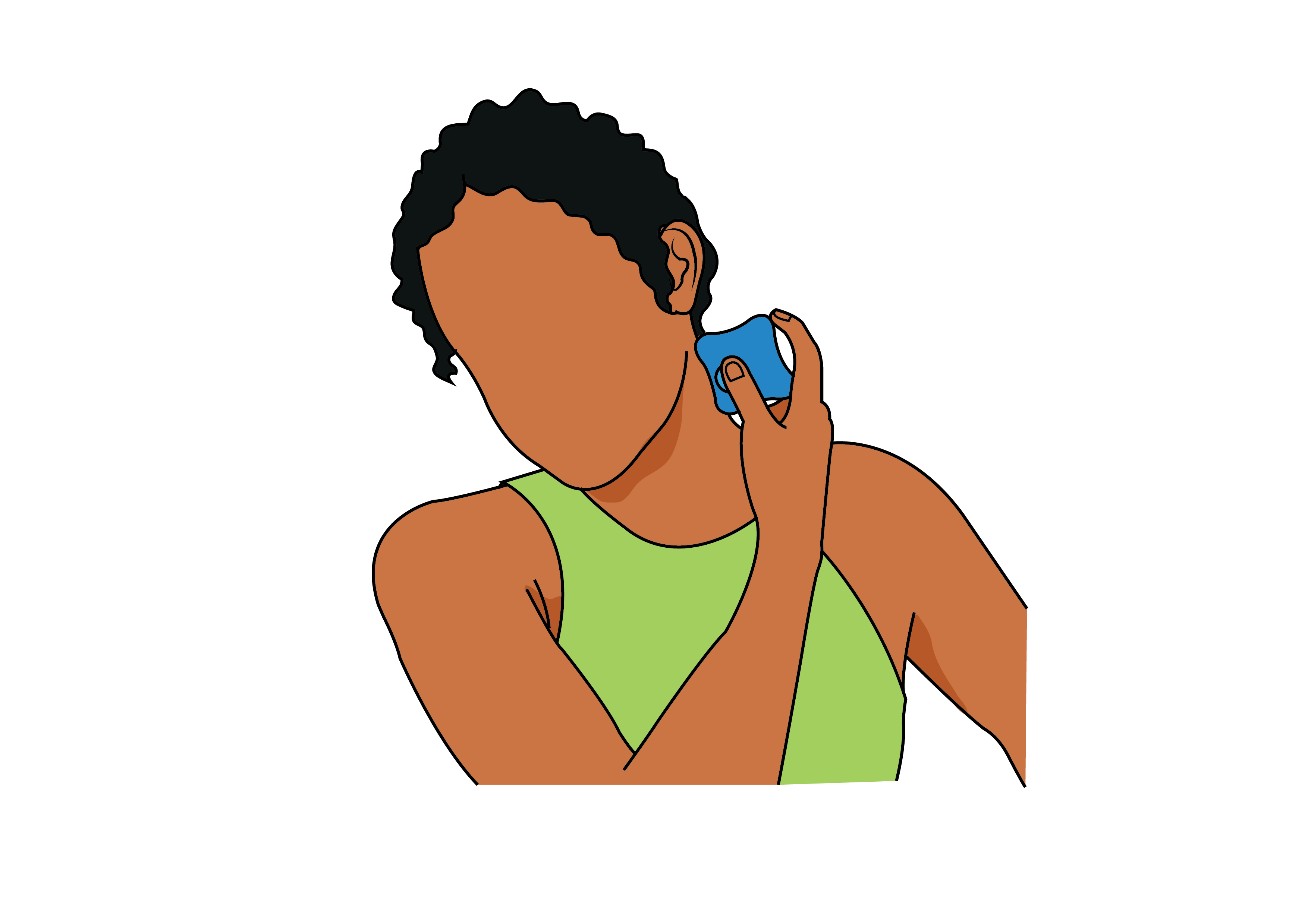 Lie down on the ground and put the massage ball behind your neck to the left of your spine, below your skull. Then, roll your head side to side making sure to avoid direct contact with your bones.